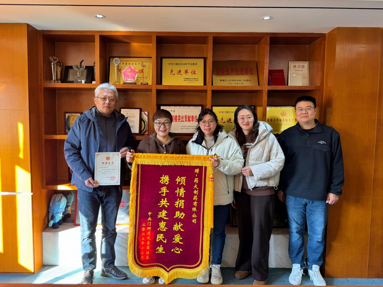 2025年12月26日,鼓楼区观音里社区王书记专程为药大制药有限公司送上一面写有“倾情捐助献爱心 携手共建惠民生”的锦旗及捐赠证书,以此感谢药大制药在2025年“慈善一日捐”活动中给予的大力支持与爱心奉献。